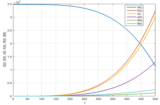 In this section, we discuss the numerical results of the COVID-19 model (1). Figure 1 depicts the upward trajectory of , representing the exposed population, and , representing symptomatic infected individuals, both of which exhibit a comparable rate of increase from time 0 to time 250. Furthermore, , denoting the number of asymptomatic infected individuals, experiences an incremental increase, although at a slower pace. The count of individuals who are infected but do not display symptoms is on the rise; however, the rate of increase is comparatively slower than that of the exposed and symptomatic infected individuals. Conversely, the number of individuals in the recovered state, , and those afflicted with COVID-19, , rises over time, displaying a positive trend. The population’s suitability or vulnerability to the virus exhibits a positive decrease over time. This observation implies that, as time progresses, the population’s susceptibility decreases, potentially attributed to immunity or other influencing factors. It is imperative to acknowledge that the aforementioned interpretation is based solely on the descriptions provided.