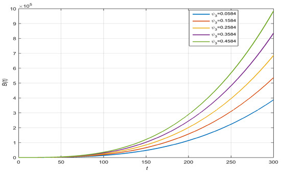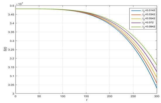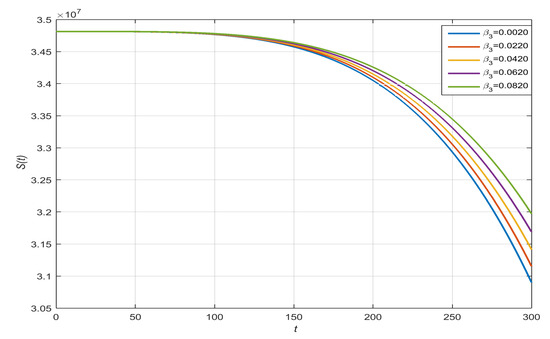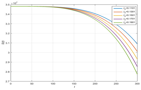 Figure 2 shows , the contact rate between exposed and susceptible people. The rate of interaction between those who are vulnerable and those who have been exposed to the virus is influenced by this parameter. As depicted in Figure 2, an increase in results in a gradual decrease in the susceptibility of individuals. This implies that a reduction in the rate of contact between exposed and susceptible individuals leads to a decrease in the number of cases of susceptibility. In particular, within the framework of Figure 2, it is demonstrated that a decrease in the contact rate () between susceptible and exposed individuals leads to an increase in the vulnerability of the population. is a contact rate among asymptomatic infected and susceptible people. Similarly to , denotes contact frequency, and it has been noted that variations in affect susceptibility in a manner comparable to variations in . If a decrease in results in a increased susceptibility, this implies that diminishing the contact frequency linked to an alternative facet of the ailment (potentially associated with a distinct demographic or mode of transmission) also renders the populace more susceptible, as seen in Figure 4. is the contact rate among symptomatic infected and susceptible people and is a contact rate among the concentration of COVID-19 in the environment and susceptible people. Parameters and are observed to exhibit a consistent susceptibility at the highest rate of variables. This indicates that changes in and do not seem to affect susceptibility in the same way as changes in and do at higher values. The susceptibility retains a constant value at its utmost level, which could indicate that these particular parameters do not have a notable effect on the susceptibility of the population at higher values, as seen in Figure 3 and Figure 5.