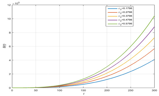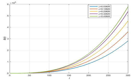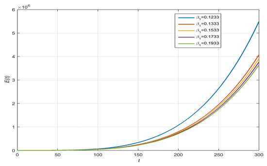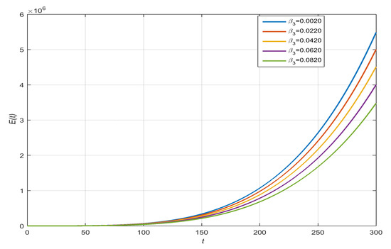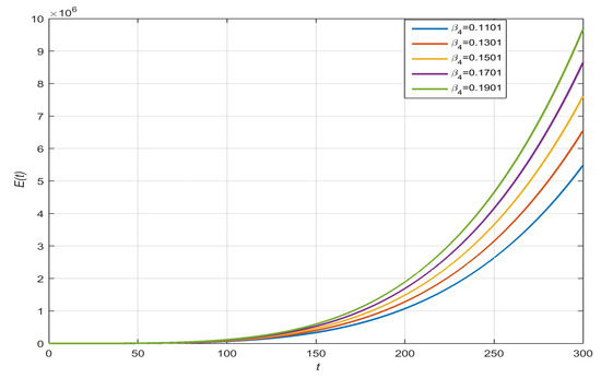 The impact of parameters , , , and on exposed people is shown graphically in Figure 6, Figure 7, Figure 8 and Figure 9. It can be seen that, by decreasing the values of , , , and , the exposed cases decrease. Figure 6 shows that the number of exposed persons reduces as increases. This implies that there is a negative relationship between the population of exposed persons and the contact rate linked to . That is, there may be a correlation between decreased exposure and increased contact. Figure 7 and Figure 8 provide evidence for a relationship in which the number of exposed people gradually increases at lower and values before reaching positive values. This suggests that the population of exposed persons gradually increases at reduced contact rates or transmission rates related to and . Figure 9 shows that the number of exposed people decreases further into the negative as the value drops. This suggests that lowering the rate of -associated contact or transmission has an adverse effect on the population of exposed persons.