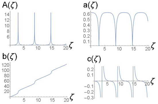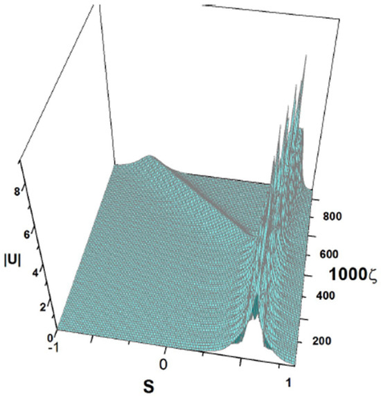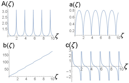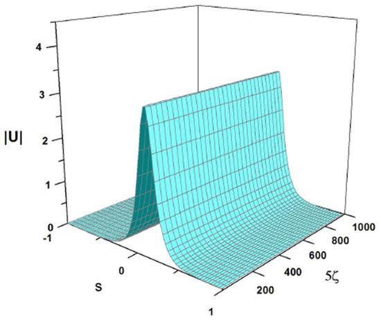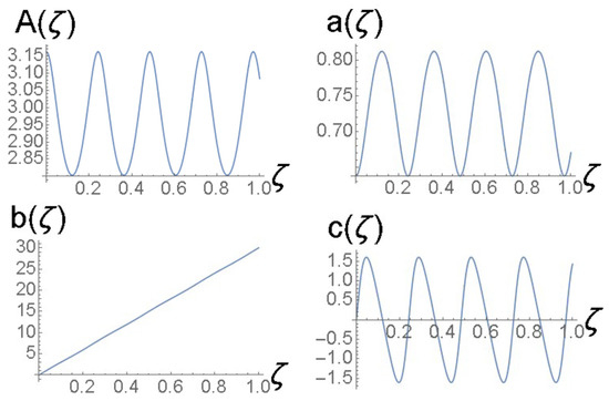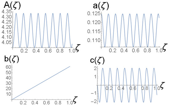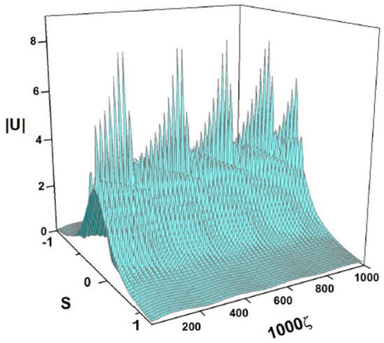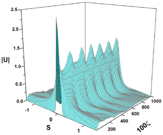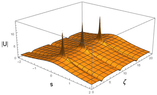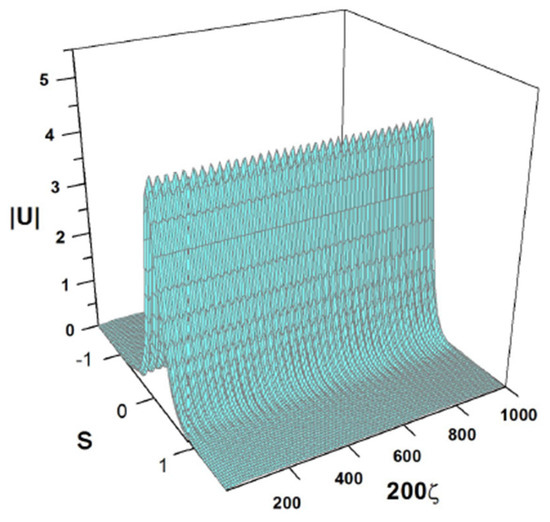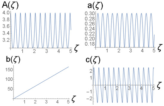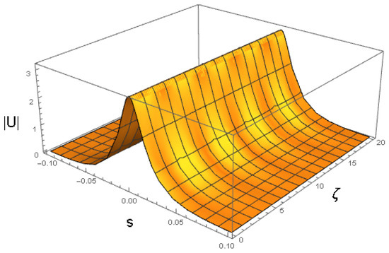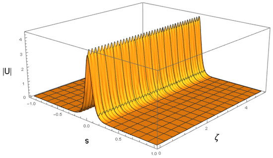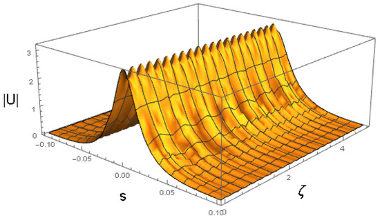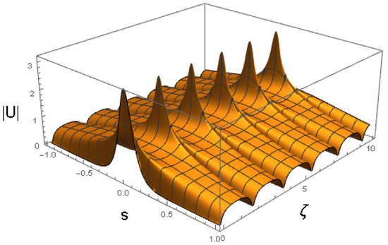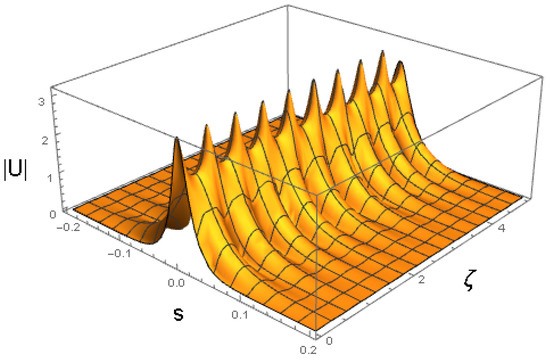 cf. Equation (41). The amplitude and width of expression (43) do not correspond to a fixed point of Equations (22) and (24), hence the solutions of the Euler–Lagrange Equations (21)–(24) produce the solutions shown in Figure 3 and Figure 4. It is a breather, i.e., a solitary wave whose amplitude and width exhibit periodic oscillations along the ζ-axis with the period .