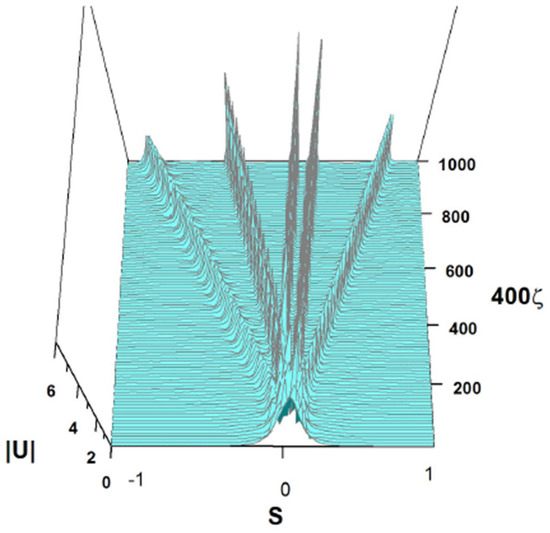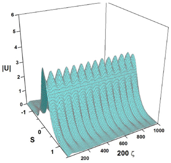 Splitting of a single pulse into multiple solitary waves is possible too. A typical example of this type is displayed in Figure 28, where the initial pulse is fragmented into five solitons with weak internal oscillations. In this case, the coefficients of Equation (7) are the same as in Figure 24, i.e., they are given as per Equation (54), and the input is as follows: