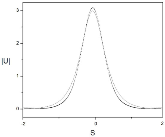 First, Figure 2 demonstrates the soliton’s shape as produced by ansatz (16) with parameters obtained from the numerical solution of the Euler–Lagrange Equations (21)–(24), with the initial conditions corresponding to a fixed point of the equations, which are and . The respective ansatz is