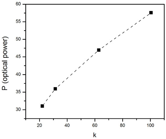 Optical power P vs. the propagation constant k of the soliton solutions of Equation (7) with the coefficients given in Equation (49).