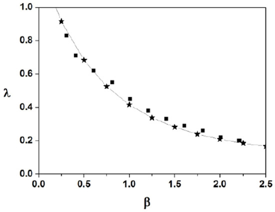 In Figure 23, we display the form of function according to the direct numerical solutions of Equation (7) (black squares) and according to the variational Equations (stars). All the results shown in this figure can be obtained using the coefficients , and in Equation (7) and the initial condition defined in Equation (45).