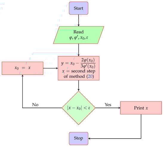 where . Numerical solver (20) is optimal under the Kung–Traub conjecture since its order of convergence equals , where represents the number of function evaluations taken by the solver at each iteration. The proposed numerical solver uses three function evaluations (one function evaluation and two of its first-order derivatives) at each iteration and has fourth-order local convergence, which is also discussed in the next section. The flowchart of the proposed two-step optimal numerical solver is shown in Figure 1.