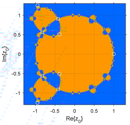 Dynamical planes illustrate the basins of attraction of the attracting fixed points, showing the stability of a single method. The implementation of the dynamical plane was developed in Matlab R2022b, following the guidelines of []. Figure 2 represents the dynamical plan of the rational operator . Orange and blue represent the basins of attraction of and , respectively. White circles refer to strange fixed points, while white squares represent free critical points. The dynamical plane only considers the initial guesses , since the rest of the dynamical plane is completely blue.