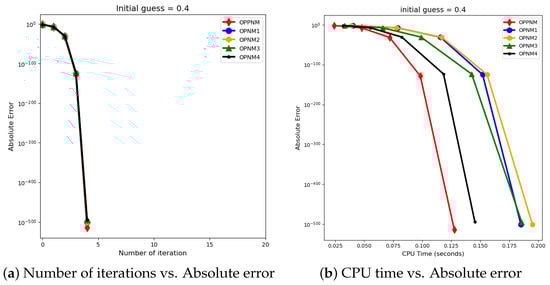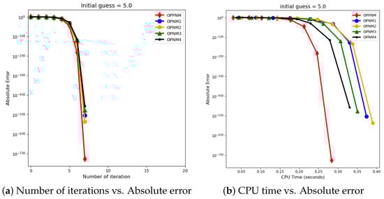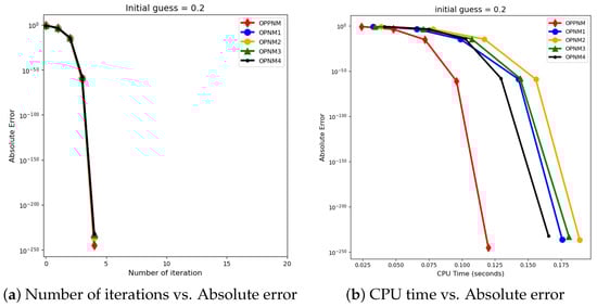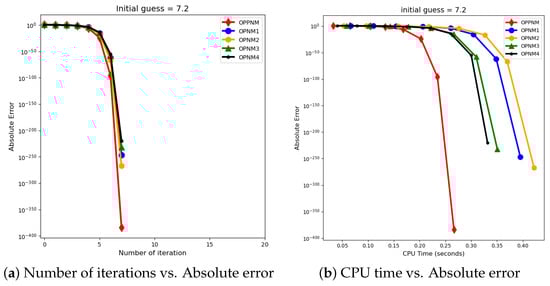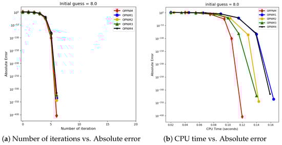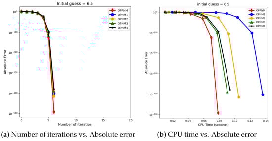 The graphical representation in the images illustrates a comparative study of different numerical solvers applied to the functions given in Problems 1–3. The efficiency curves are plotted in Figure 3, Figure 4, Figure 5, Figure 6, Figure 7 and Figure 8 to show the relationship between the precision of the solution, measured by the absolute error on the y-axis, and the computational effort, represented by the number of iterations and CPU time on the x-axis. In both sets of comparisons, the OPPNM method emerges as the most efficient. Specifically, for the initial guesses of 6.5 and 8.0 for , OPPNM achieves a rapid convergence to a low absolute error, outpacing the other methods. The steep descent of the OPPNM curves demonstrates its swift reduction in error as iterations progress, and it also shows significantly less CPU time required to reach a similar level of accuracy compared to its counterparts. This suggests a high rate of convergence and lower computational cost, making OPPNM the preferred solver based on the data presented. The claim that OPPNM is an optimal fourth-order method is substantiated by its apparent superior performance, both in terms of speed and computational resources. A similar sort of observation is made for Problems 2 and 3 in their efficiency curves.