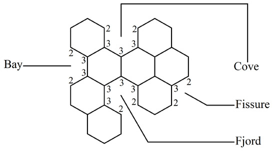 The following definitions, as presented in [31], are applicable. Let B be a benzenoid system with v vertices and p hexagons. For any path of length ) within B, the associated vertex degree sequence is defined as . Subsequently, a fjord, cove, bay, and fissure refer to paths with degree sequences (2, 3, 3, 3, 3, 2), (2, 3, 3, 3, 2), (2, 3, 3, 2), and (2, 3, 2), respectively. These paths are traversed along the perimeter of B, as depicted in Figure 1. Fjords, coves, bays, and fissures are all considered different types of inlets. The number of inlets, k, is then defined as the total number of fjords, coves, bays, and fissures summed.