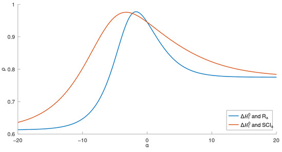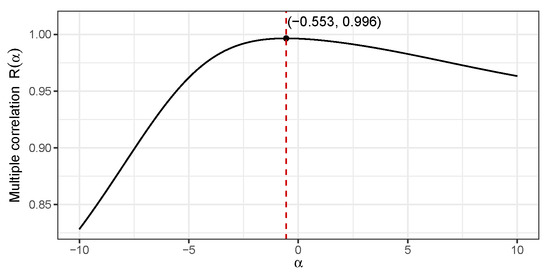 In the case where the response variable y depends on an unknown parameter , the value of multiple correlation above also depends on , i.e., . A preliminary plot of in the region reveals a unimodal shape with a maxima in this region. A built-in optimizer in the R programming language was employed that yielded the value that maximizes the multiple correlation value . Figure 8 presents the corresponding plot elaborating this calculation.
