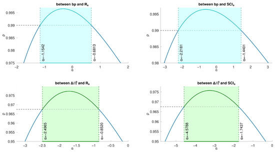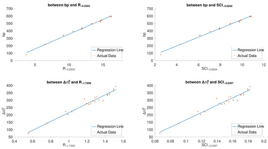 There exists a good correlation between and when is in some interval. For example, for , and have a correlation coefficient greater than 0.996558. Similarly, there also exists—for in different intervals—a good correlation between and , between and , and between and , as shown in Figure 6.