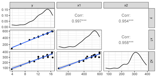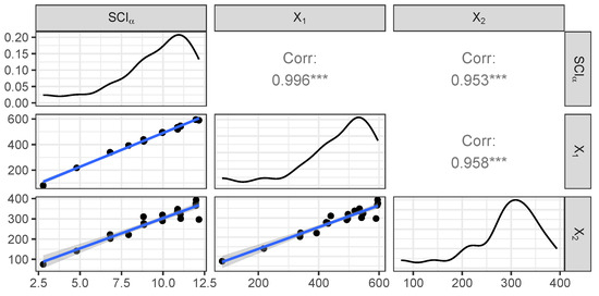 Figure 11 exhibits the matrix plot, showing the distribution of the variables as well as the bivariate relationships between them (using the optimal value ).
