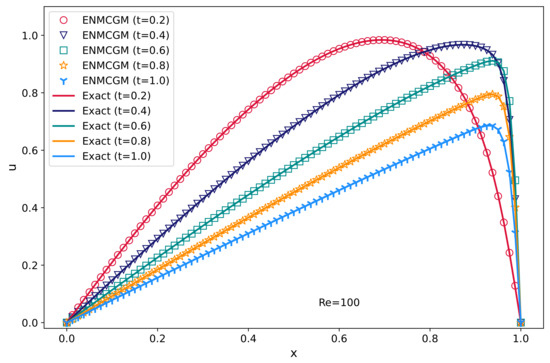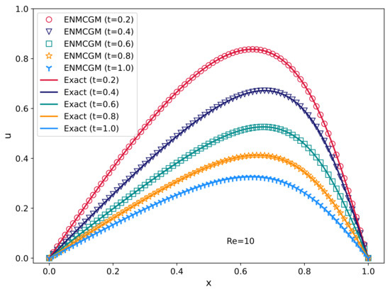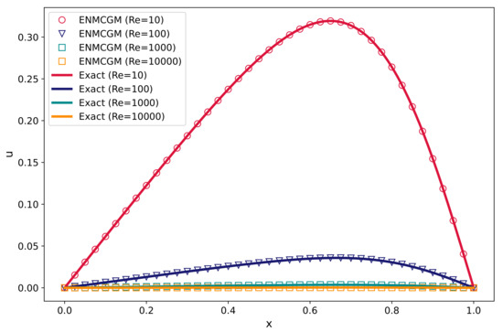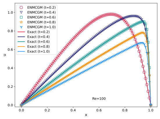 Plenty of numerical examples are conducted to validate the proposed method for varied initial conditions and boundary conditions as well as varying Reynolds numbers. We evaluated the results by contrasting them with analytical solutions and findings obtained from alternative methods. Comparisons demonstrate that the proposed ENMCGM is accurate and stable, even for large Reynolds numbers. The outline of this paper is arranged as follows.