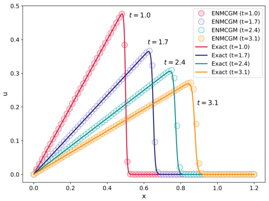 Example 2. This example addresses the Burgers’ equation with the following IC and BC,The analytical solution for this problem shares the identical structure as Equation (37), albeit with distinct coefficients. and become the following integrals [30] in this problem We solve this problem using the ENMCGM for and , respectively. During the computation, we use the uniform MC mesh with , and fix the time step size .