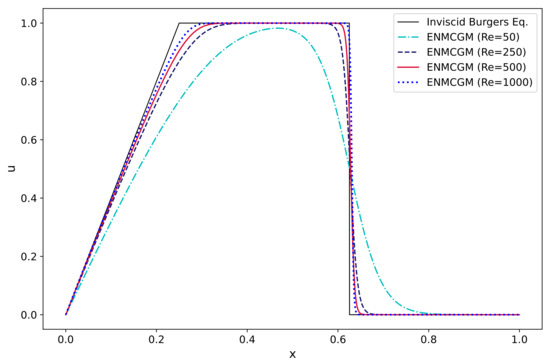 Example 5. In this example, we verify the presented method by solving Equation (1) with the following ICand the BC: , , . The inviscid Burgers’ equation below with the above IC and BC constitute a Riemann problem,Its exact solution can be obtained by the characteristic method, that isFrom Equation (1), we can find that Burgers equation is just Equation (48) plus a viscosity item. Thereby, the solution of Equation (48) is actually smoothed by the diffusion term in Equation (1). In order to examine such smoothing behavior, we solve Equation (1) for varied Reynolds numbers and times. This comparison test has also been investigated by Chen and Jiang [32]. Figure 15 compares our results for Burgers’ equation Equation (