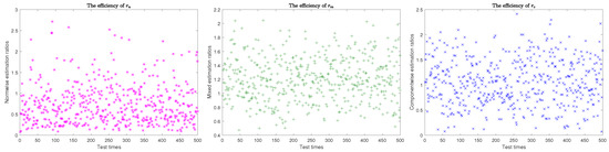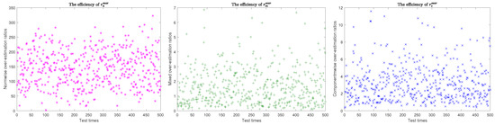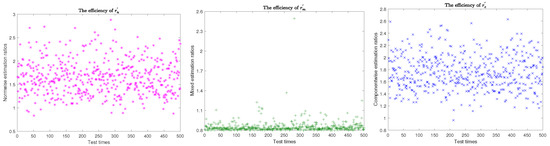 Figure 1 demonstrates that Algorithms A and B are very efficient in estimating condition numbers of . To evaluate the efficiency of the Algorithms A and B, we created 500 matrix pairings and set , , , and with fixed . In order to determine the effectiveness of Algorithms A and B, we specify the following ratios: