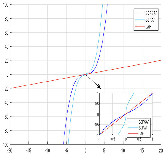 For the ADISZNN model, different activation functions will result in different degrees of convergence in the model solution. To maintain generality in our discussion, we consider the three most common types of activation functions: linear-like activation functions [26], sigmoid-like activation functions [27], and sign-like activation functions [34,35,36]. Here, we take the linear activation function (LAF), smooth bi-polar sigmoid activation function (SBPSAF), and signal bi-power activation function (SBPAF) as examples. They are defined as follows: