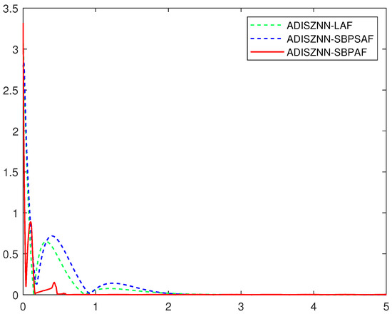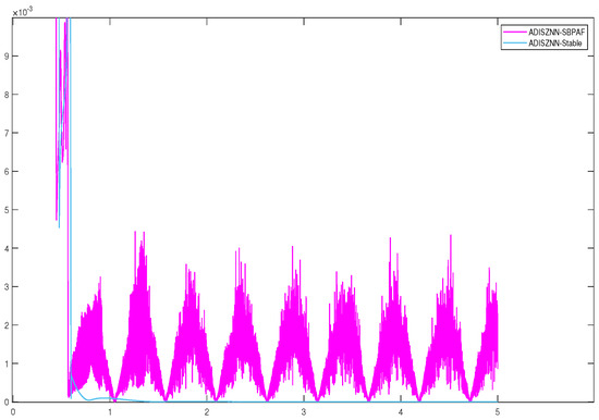 However, during the experimental process, we observed that the residual plot of the ADISZNN model with the signal bi-power activation function exhibits oscillatory fluctuations after reaching the magnitude of at 0.6 s. This indicates a decrease in the precision of the model’s computations, as it fails to maintain stable convergence at the magnitude level. This implies a reduction in the robustness of the ADISZNN model. The residual plots of the ADISZNN model with noise interference and the comparison of residuals between the DISZNN and ADISZNN models without noise interference are shown in Figure 6 and Figure 7, respectively. In the next subsection, we will discuss the stable version (high-precision version) of the ADISZNN model.