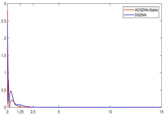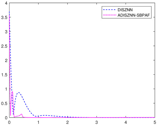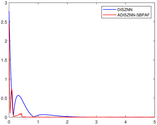 Convergence comparison of ADISZNN and DISZNN without noise interference; the design parameters are and : ADISZNN-SBPAF (red solid line) and DISZNN (blue solid line).