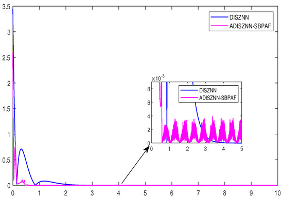 To compare the tolerance of ADISZNN and DISZNN to noise, a common linear noise is introduced. Their numerical experimental comparison is shown in Figure 5, where the design parameters are set as , , and . Under the interference of linear noise, both DISZNN and ADISZNN can still make the residual close to 0 within approximately 2.8 s and 0.6 s, respectively, which is nearly the same as the case without noise interference. This demonstrates that ADISZNN and DISZNN possess inherent tolerance to linear noise.
