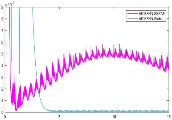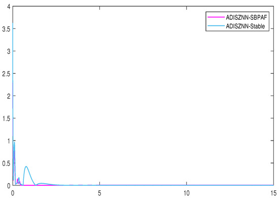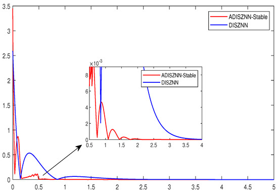In Figure 11, a comparison between the stable version of the ADISZNN model and the original DISZNN model is presented. Compared to the original DISZNN model, the stable version of the ADISZNN model exhibits significant improvements. When the computed solution of the model converges to a theoretical state approximation , the convergence time of the stable ADISZNN model is reduced from 2.8 s to 1.9 s. Moreover, the convergence curve of the stable ADISZNN model appears smoother and more refined. Both models achieve a computational accuracy of when fully converged. These results indicate that the improved stable version of the ADISZNN model not only enhances the convergence speed but also maintains robustness comparable to that of the DISZNN model.