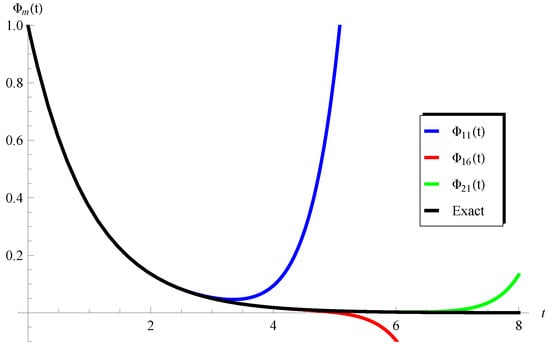 The objective of the first part of this section is to invest the preceding analysis to derive the exact solutions of some classes in the literature. It will be shown that exact solution of the problem (1) is available and can be directly obtained from (14) under specific selection of the parameters a, b, , , and . In other situations in which the Formula (14) does not lead to the exact solution, the accuracy of the present approximations will be checked and examined through calculations of the residual errors.