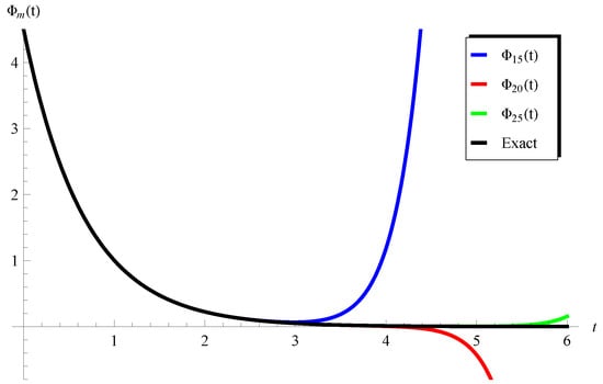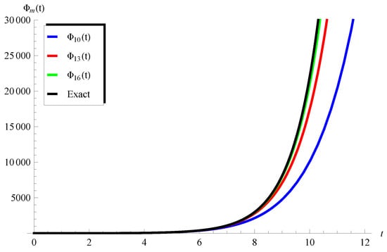 Figure 1 shows the comparison between the approximations , and the exact solution for the model (32) at . It is clear from this figure that the approximations approaches the exact solution and the domain of agreement is enlarged by increasing the number of terms m. In addition, Figure 2 and Figure 3 confirm this conclusion at different values of the involved parameters.