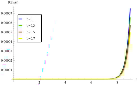 In Figure 4 and Figure 5, the residual errors , are displayed at , , , , when (Figure 4) and (Figure 5). The numerical results show acceptable accuracy, especially when the number of terms increases. Furthermore, the influence of the parameter a on the residual error is depicted in Figure 6 at , , , , and . This figure indicates that the residual increases by the increase in a while Figure 7 declares a converse behaviour for the influence of the parameter b on the residual error . The above discussion reveals the effectiveness and efficiency of the proposed analysis which can be implemented to analyze other forms of the inhomogeneous pantograph equation.