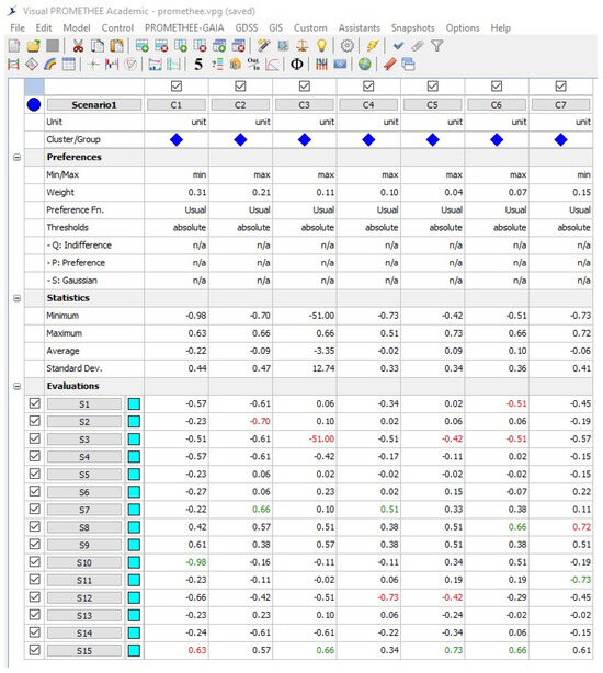 Visual PROMETHEE GAIA is a new tool for the visualization of rankings and information on spatial decision problems. The objective of Visual PROMETHEE GAIA is to provide decision makers simple but effective representations to improve the comprehension of convoluted scenarios concerning decision making, especially when dealing with imprecision and ambiguity. Figure 3 displays the data entered for PROMETHEE calculation. Criteria according to scenarios, preference of the criteria like max for beneficial and min for non-beneficial criteria, weight of the criteria, and preference function can be set up. The decision values obtained from experts considering -level are entered in the appropriate places which has been carried out using the score values of FFN. Visual PROMETHEE performs the automatic calculation of the statistical data.