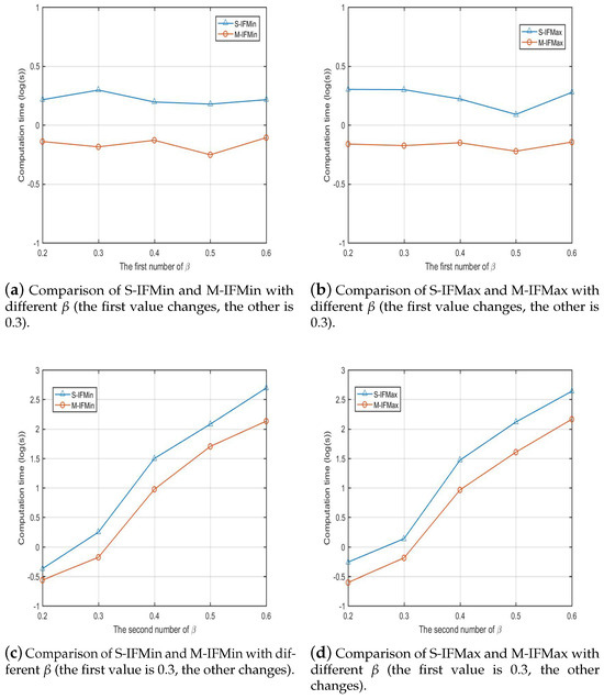 To compare the computational time of M-IFMin, M-IFMax, S-IFMin and S-IFMax with different values of in Figure 1, we set the size of U to 200 and the size of to 600. The one value of ranges from to , gradually increasing by a step of , and the other value is . Figure 1a,c show the computational time of M-IFMin and S-IFMin. In Figure 1a, the first value of ranges from to , gradually increasing by a step of , and the second value is . In Figure 1c, the first value is and the second value of ranges from to , gradually increasing by a step of . Figure 1b,d show the computational time of M-IFMax and S-IFMax. In Figure 1b, the first value of ranges from to , gradually increasing by a step of , and the second value is . In Figure 1d, the first value is and the second value of ranges from to , gradually increasing by a step of . In Figure 1, we can see that the computational time of M-IFMin, M-IFMax, S-IFMin and S-IFMax decreases with the gradual increase in the value of . M-IFMin (or M-IFMax) is more efficient than S-IFMin (or S-IFMax) with different values of , especially with small values of .