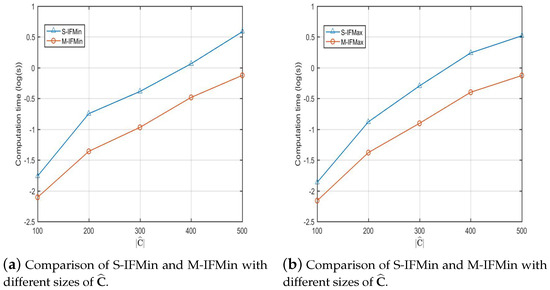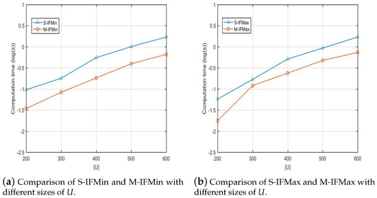 To compare the computational time of M-IFMin, M-IFMax, S-IFMin and S-IFMax with different sizes of in Figure 3, we set the value of to and the size of U to 200. The size of ranges from 100 to 500, gradually increasing by a step of 100. In Figure 3, we can see that the computational time of M-IFMin, M-IFMax, S-IFMin and S-IFMax increases with the gradual increase in the size of U. M-IFMin (or M-IFMax) is more efficient than S-IFMin (or S-IFMax) with different sizes of , especially with large .