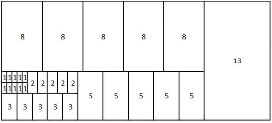 The tile defined by Fibonacci numbers represents a plane. In studies [25,26,27], it is stated that a plane is tiled with , , and . Now let us generally denote the tiling covering of a plane by . For example, can be seen in Figure 1.