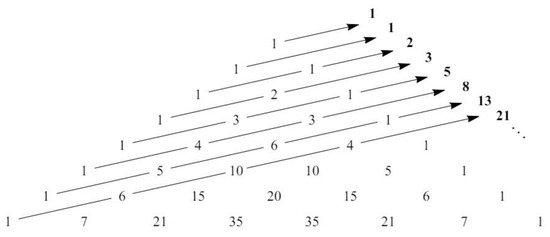In 1876, the French mathematician Édouard Lucas made a notable discovery regarding Fibonacci numbers. He observed that these numbers can be derived from the sums of the elements along the north–east diagonals of Pascal’s triangle. This revelation established a profound connection between two fundamental sequences in mathematics: the Fibonacci sequence and the binomial coefficients represented in Pascal’s triangle. Lucas’s insight not only highlighted an elegant combinatorial property but also enriched the mathematical understanding of Fibonacci numbers, demonstrating their pervasive presence in various mathematical structures and sequences (see Figure 2) [18]. In [25,26,27] and in this study, the connection between Pascal’s triangle and distance Fibonacci numbers is examined.