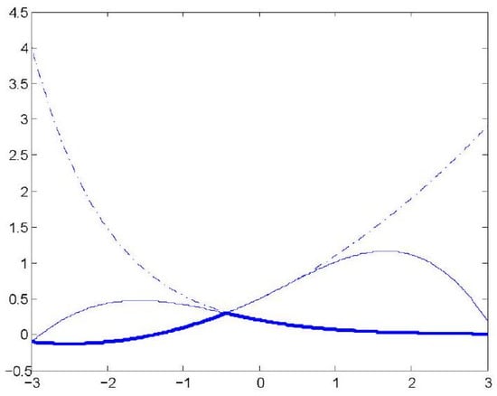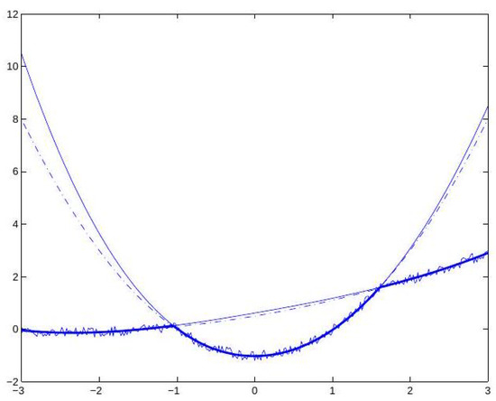 In Figure 1 and Figure 2, we see the results of reconstructing piecewise-smooth functions from exact data and noisy data. In both cases, and . The solution of the optimization problem (2.2) is depicted in a bold line. The underlying function f is generated as , and the graphs of these two generating functions are depicted by dashed lines. The fine continuous lines in the figures represent the functions and , which, as we see in those graphs, approximate and accordingly, and the approximation is good only in the appropriate regions. Here, , and thus we have 10 unknown parameters to solve for. The optimization has been performed using a differential evolution procedure, using the data values at the points as the starting points of the iterations for both and .