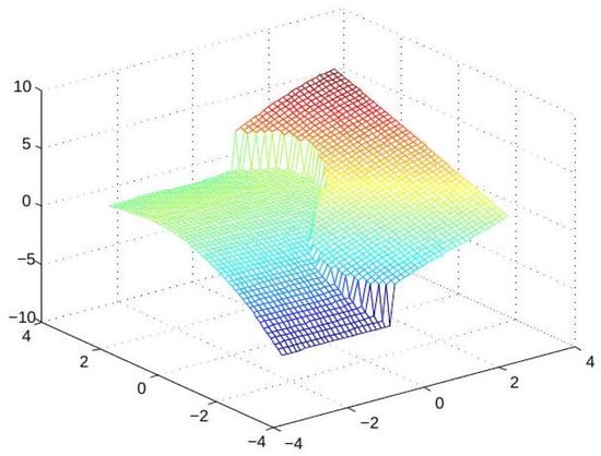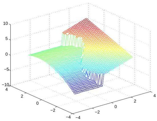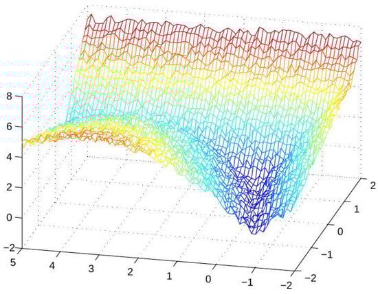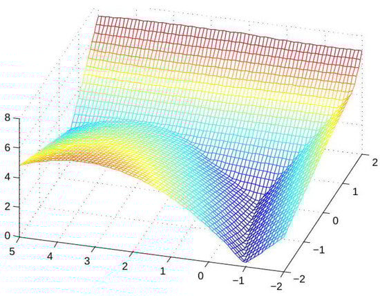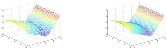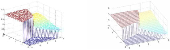 We start with a numerical demonstration of a direct extension of the univariate approach to the approximation of continuous piecewise-smooth bivariate functions. Recalling the 1D discussion, the choice of a min or a max operation depends on the sign of . In the 2D case, we refer to an analogous condition involving the slopes of the graph along the singularity curves. A discontinuity (singularity) of the normals of a bivariate function f is said to be convex along a curve if the exterior angle of the graph of f at every point along the curve is (e.g., see Figure 3), and it is considered to be concave if the exterior angles are . In a neighborhood of a concave singularity (discontinuity) curve, the function may be described as the minimum between two (or more) smooth functions, and near a convex singularity curve the function may be defined as the maximum of two or more smooth functions. Let us consider the following noisy data, , taken from a function with convex singularities. For the numerical experiment, we take X as the set of data points on a square grid of mesh size in , and the provided noisy data are shown in Figure 4. In this case, the function has a ‘3-corner’-type singularity, where f has convex singularity along three curves meeting at a point. Therefore, we look for three spline functions, , so that