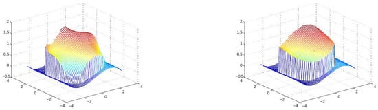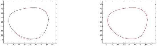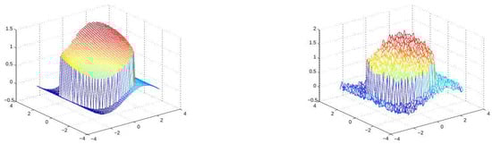 This section demonstrates the performance of the method for the approximation of noisy data of a function with jump discontinuity. Furthermore, we use this example to emphasize the importance of using the restricted sets in rather than using . The underlying function and its noisy version are displayed in Figure 9. In the numerical test, we have used the same mesh and knot sizes as in the previous example. In Figure 10, we show the results with and without restricting the set of points that participate in the computation of . In the left graph, we note that the approximation in the inner region is infected by wrong values from the outer region, and this is corrected in the right graph where the least-squares approximations use values that are not too close to the discontinuity curve. In Figure 11, we see two approximations to the exact singularity curves (in red), using different knots’ grid sizes, and , together with the singularity curve of the underlying function. As expected, a smaller enables higher flexibility of and a better approximation to the exact curve.