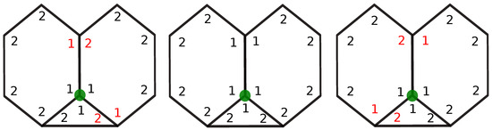 The first three configurations are illustrated in the same order in Figure 2, where we see that only the second configuration leads to compatible nodes. Indeed, not all configurations are compatible, and the neighbouring faces must have matching node types: on the first arrangement, the second face must have a second node of type 2 to match the face, and the two hexagons have a node mismatch above the green dot. One sees graphically that the only compatible configuration is the middle one: .