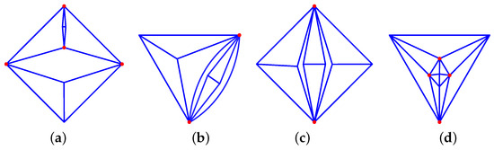 Figure 5. Special graphs: (a) 34_F8_4-1-3_4-2-1_V4_4, (b) 36_F8_4-1-2_4-2-1_V4_2, (c) 36_F9_3-2-2_6-2-1_V6_2, (d) 45_F12_4-2-1_8-1-2_V4_4. - One 2D diamond and one 2D bubble diamond: 36_F8_4-1-2_4-2-1_V4_2, (see Figure 5b)