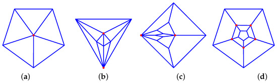 In what follows, we will be using some graph components to describe the biequivalent graphs. They are presented in Figure 4, where the blue dots represent the nodes that will be linked to the rest of the graph. We will also use the following abbreviations: P-gone for a polygon with P edges, P-star for a polygonal star with P branches, P-fan for polygonal fan with P blades, split P-fan for a split polygonal fan with P blades, inverted P-fan for inverted polygonal fans with P blades, and P-mosaic for mosaic with a P-gon at its centre. We also refer to pyramids, prisms, and antiprisms with a P-gonal base as, respectively, P-pyramids, P-prisms, and P-antiprisms.