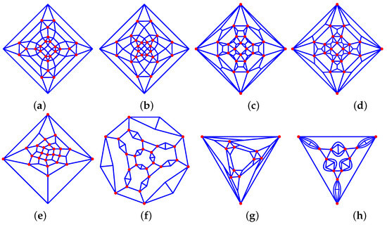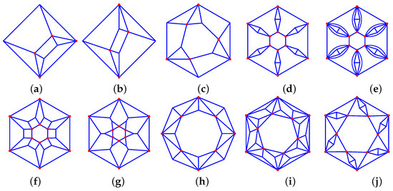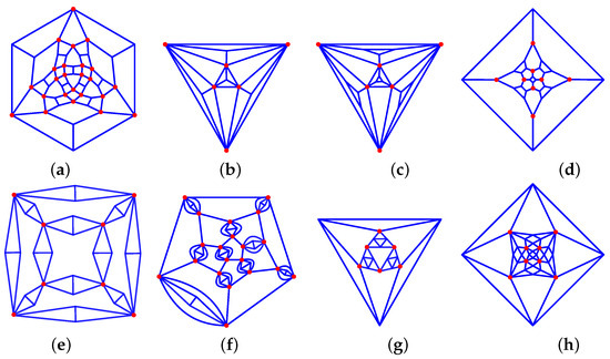 Graphs do occur in a number of areas of science such as the study of complex protein networks [21], quantum field theory [22], neurology [23], or mathematics [24]. The symmetry of graphs has been studied extensively [25], but here, we restrict ourselves to planar graphs. As we have stated above, planar graphs where all the nodes are equivalent, modulo of an automorphism of the graphs, and correspond to the planar graphs of convex uniform polyhedra. In this paper, we are constructing planar graphs made out of two families of equivalent nodes.