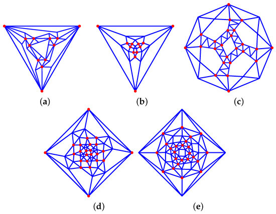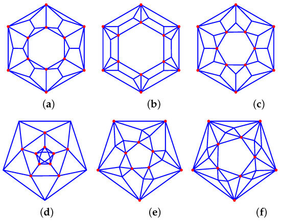 Figure 15. Archimedean solids-derived graphs: (a) 36_F32_4-0-3_4-3-3_24-1-2_V12_12 *, (b) 44_F26_4-0-3_4-3-0_18-2-2_V12_12, (c) 45_F62_6-4-4_8-0-3_24-1-2_24-2-1_V24_24 *, (d) 55_F74_6-0-4_8-3-0_12-2-2_24-1-2_24-2-1_V24_24 *, (e) 56_F86_6-4-0_8-0-3_24-2-1_48-1-2_V24_24 *. - –