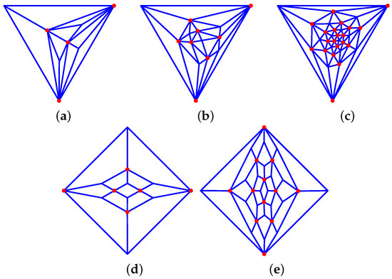 Figure 17. Archimedean solids-derived graphs: (a) Triakis tetrahedron: 36_F12_12-1-2_V4_4. (b) Triakis hexahedron: 46_F24_24-1-2_V6_8. (c) Pentakis dodecahedron: 56_F60_60-1-2_V12_20. (d) Rhomic dodecahedron: 34_F12_12-2-2_V8_6. (e) Rhomic tricontahedron: 35_F30_30-2-2_V20_12. - Triakis hexahedron: 46_F24_24-1-2_V6_8 (see Figure 17b).