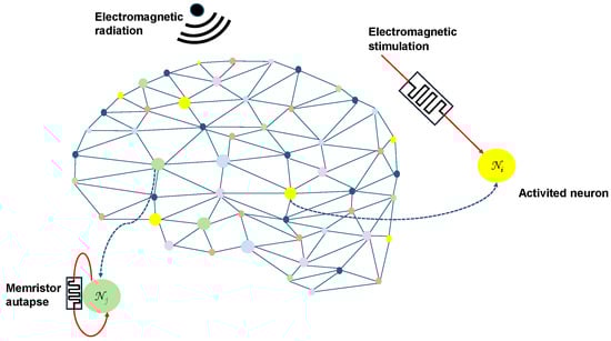 Memristor-based neural network models can be divided into (see, e.g., [26,27]) (a) memristive synaptic (autapse or synapse) models, in which a memristor is used as a variable connection weight for neurons; (b) neural network models affected by electromagnetic radiation, in which a memristor is used to simulate the electromagnetic induction effects. The memristive synaptic model uses the bionic properties of the memristor to realistically mimic biological synaptic functions, while the neural network model under electromagnetic radiation employs a magnetic flux-controlled memristor to imitate the electromagnetic induction effect on membrane potential.