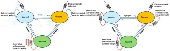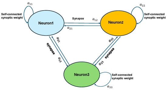 The functions , for , represent the memristor’s synaptic connection weight coefficient (an example with three neurons is depicted in Figure 3).