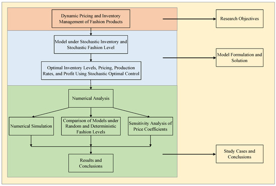 In recent years, there has been extensive research on dynamic pricing and inventory management issues for fashion products [1,2,3]. Due to their short product lifecycle and high demand volatility, special attention needs to be paid to initial ordering before the sales season starts, as well as replenishment decisions during the sales season [4,5,6]. With the advancement of information technology, dynamic pricing has become easier, thus attracting widespread attention to dynamic pricing strategies in enterprises [7,8,9]. However, unlike general products, fashion apparel belongs to short-lifecycle products, where the value or quantity of most products in inventory will decline over time, similar to characteristics of deteriorating items [10]. Therefore, research on inventory and pricing decisions for fashion products should draw insights from studies on perishable inventory and pricing decisions. Kinkaid and Darling [11] were among the first to investigate the dynamic pricing of perishable items. Gallego and Ryzin [12] developed an inventory model to study dynamic pricing problems with price-sensitive and stochastic demand. Wang et al. [13] and Aladwani et al. [14] studied the optimal dynamic decisions for non-immediately deteriorating items, with the distinction that Aladwani et al. [14] allowed for delayed payments. Rabbani et al. [15] assumed demand to be a time-varying function of price discounts and initial prices, establishing a perishable inventory model dependent on quality, price, and time. Mohammadi et al. [16] developed a multi-objective mixed-integer nonlinear programming model for perishable products with price-dependent demand and deterioration rates. Halim et al. [17] considered the characteristics of nonlinear pricing and linear inventory-dependent market demand for nonlinearly deteriorating items models. Udayakumar [18] analyzed a model for perishable items with price-sensitive demand functions dependent on inventory, allowing for shortages. Almathkour et al. [19] studied a finite horizon inventory model with time-varying demand, non-instantaneously deteriorating items, and backlog. Thus, due to the perishable nature and time-varying characteristics of fashion apparel, implementing joint and time-varying dynamic pricing and production strategies is crucial for managing inventory replenishment and increasing net profits. However, aside from the direct impact of fashion levels, production rates, and demand rates on inventory levels, apparel inventory inevitably faces external stochastic disturbances, such as product returns, stockouts, and human damages [20,21,22,23]. Considering the impact of external stochastic disturbances on inventory levels, research on joint dynamic pricing and inventory strategies in stochastic fashion apparel inventory systems has become a hot topic in recent years.
