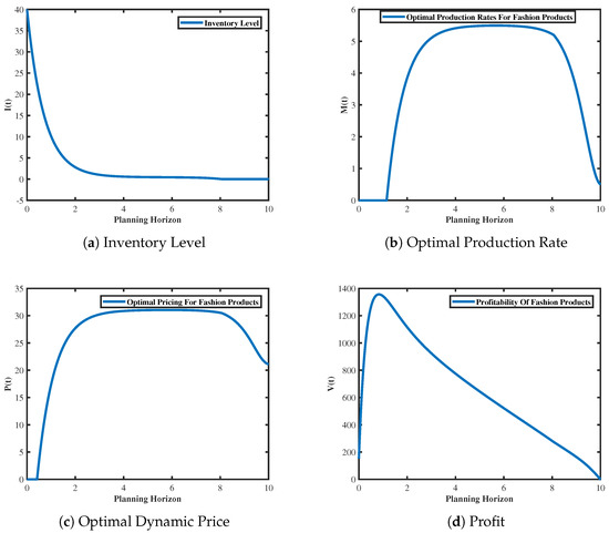 To validate the effectiveness of the mathematical model presented in Section 3, we drew upon the parameters obtained from numerical simulations in the studies in [34,42]. The parameters of our model are specified as follows: initial demand quantity 40, the demand per unit of time , the price coefficient , time range to , initial fashion level , fashion decay factor , inventory drift parameter , and volatility parameter of the fashion level function . Using Matlab 2017b code, we obtained graphical representations of the inventory function (see Figure 3a), the optimal production rate (see Figure 3b), the optimal dynamic pricing (see Figure 3c), and the profit (see Figure 3d). These figures better illustrate the underlying mechanisms in the model.