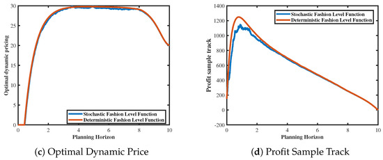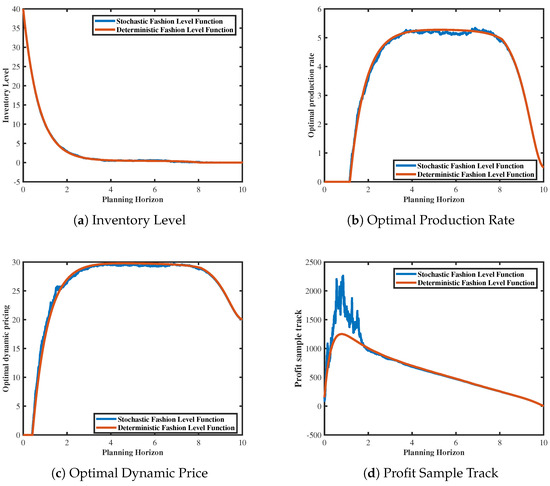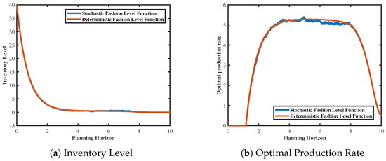 To elucidate the feasibility and practicality of the model, we compared it with the results of deterministic fashion level [34], investigating the variations in inventory function, optimal production rate, dynamic pricing, and profit—four key performance indicators. Interestingly, Figure 4 shows that the stochastic fashion level function indeed exerts a noticeable influence on the aforementioned metrics of fashion products discussed earlier. By comparing the stochastic fashion level model with the deterministic one, we derived some meaningful managerial insights.