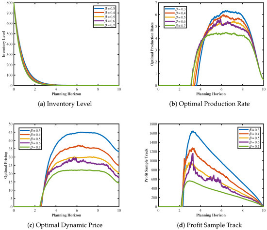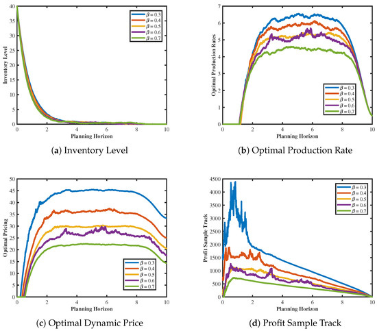 Inventory level, dynamic pricing, optimal production rate, and profit sample track trends under different coefficient values.