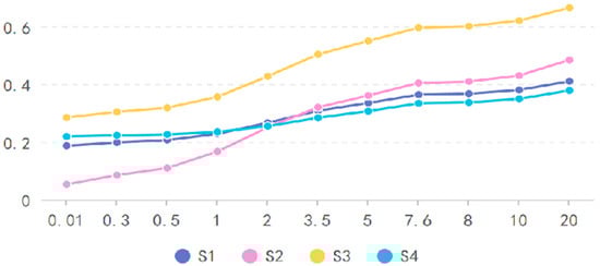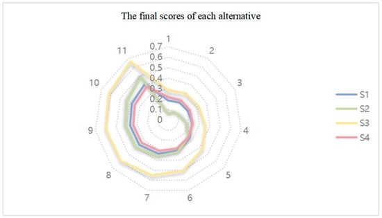 Figure 3 illustrates the influence of parameter changes on the scores of each alternative. It can be seen that the parameter changes have the most significant impact on , followed by . The scores of and do not change significantly with increasing parameter values. Therefore, Alternatives 2 and 3 are more significantly affected by changes in the parameter.