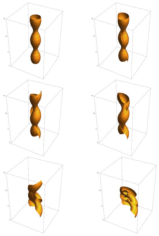 We start with a fixed mean curvature H and (23) and the Delauney surfaces of that mean curvature which we want to deform (with parameter , i.e., via (42)). By continuous movement of parameter from 0 to (which continuously changes parameters m, B, and h in formulas (43)) and substituting those values into (24), we obtain new helicoidal surfaces, all with the same mean curvature H. In the images in this paper, we have restricted ourselves to choices in (23) and to the time intervals for where the pitch h is positive, albeit the images in the time interval for where the pitch h is negative are basically the same up to an isometry of .