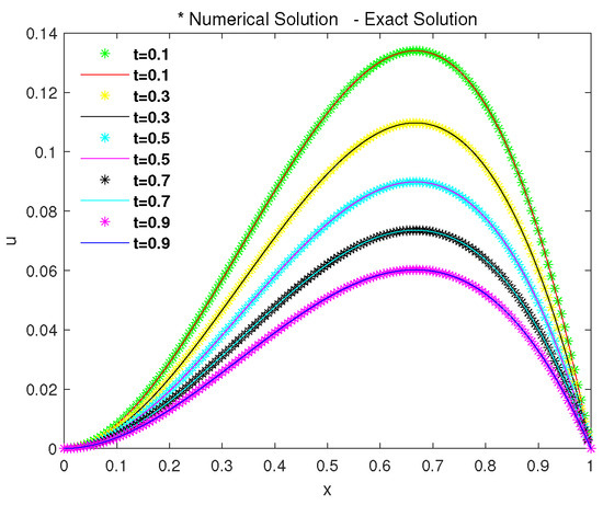 Setting the space step size to , the time step size to , and , Figure 1 shows the comparison between the exact solution (line) and the numerical solution (star) of the weighted explicit finite difference method at (where to with an interval of ). Figure 2 shows a comparison between the analytical solution (line) and the numerical solution (star) of the reduced-dimension weighted explicit finite difference method for Equation (45). In Figure 1 and Figure 2, it can be observed that the numerical solution of Equation (45) is in good agreement with the analytical solution, which further demonstrates the effectiveness of the method.